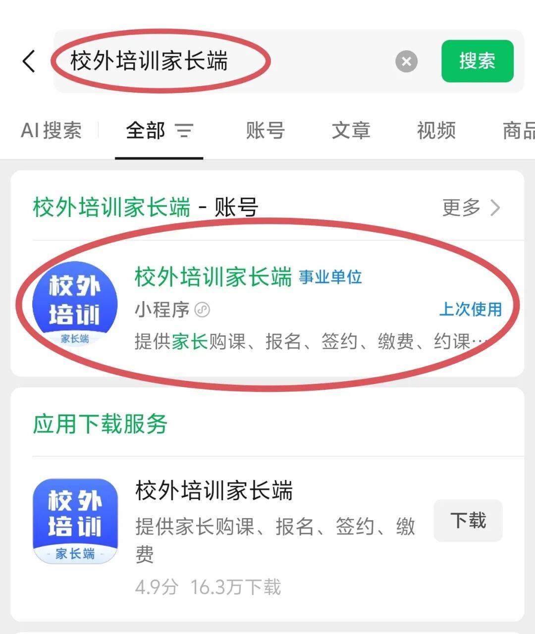 微信端:打开微信,在搜索栏输入“校外培训家长端”,点击进入小程序;如图: